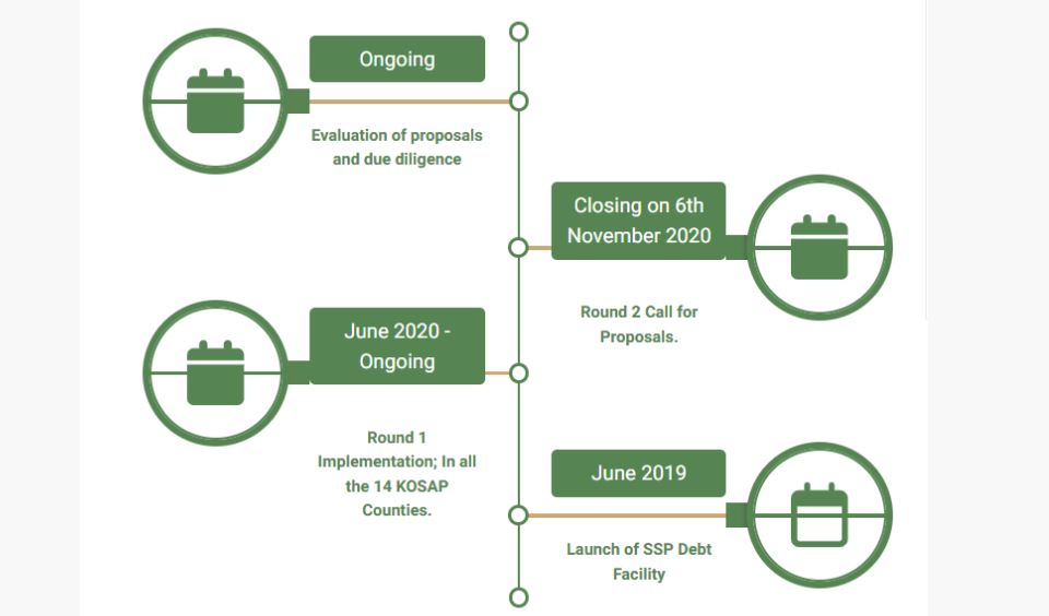 The KOSAP Solar Service Providers Results-Based Financing (SSP RBF Facility) will award a total of US $12 million (in Kenya Shillings) in financing to compensate solar home systems service providers (SSPs) for initial, ongoing incremental, and opportunity costs associated with an expansion of operations in the KOSAP Service Territories (KSTs)